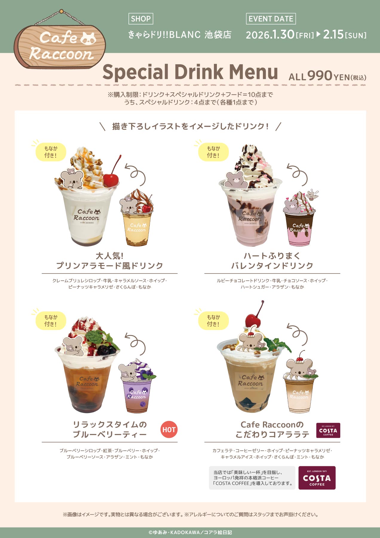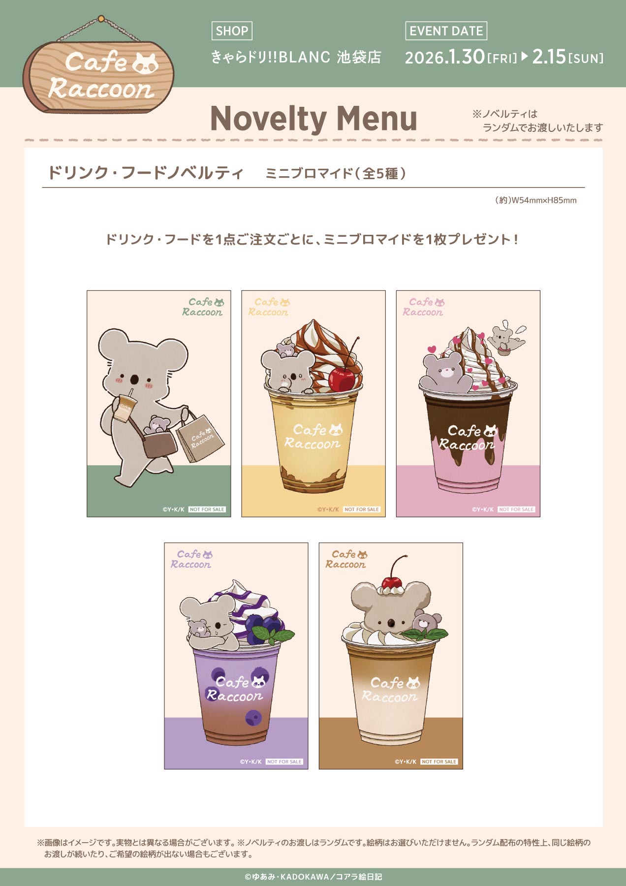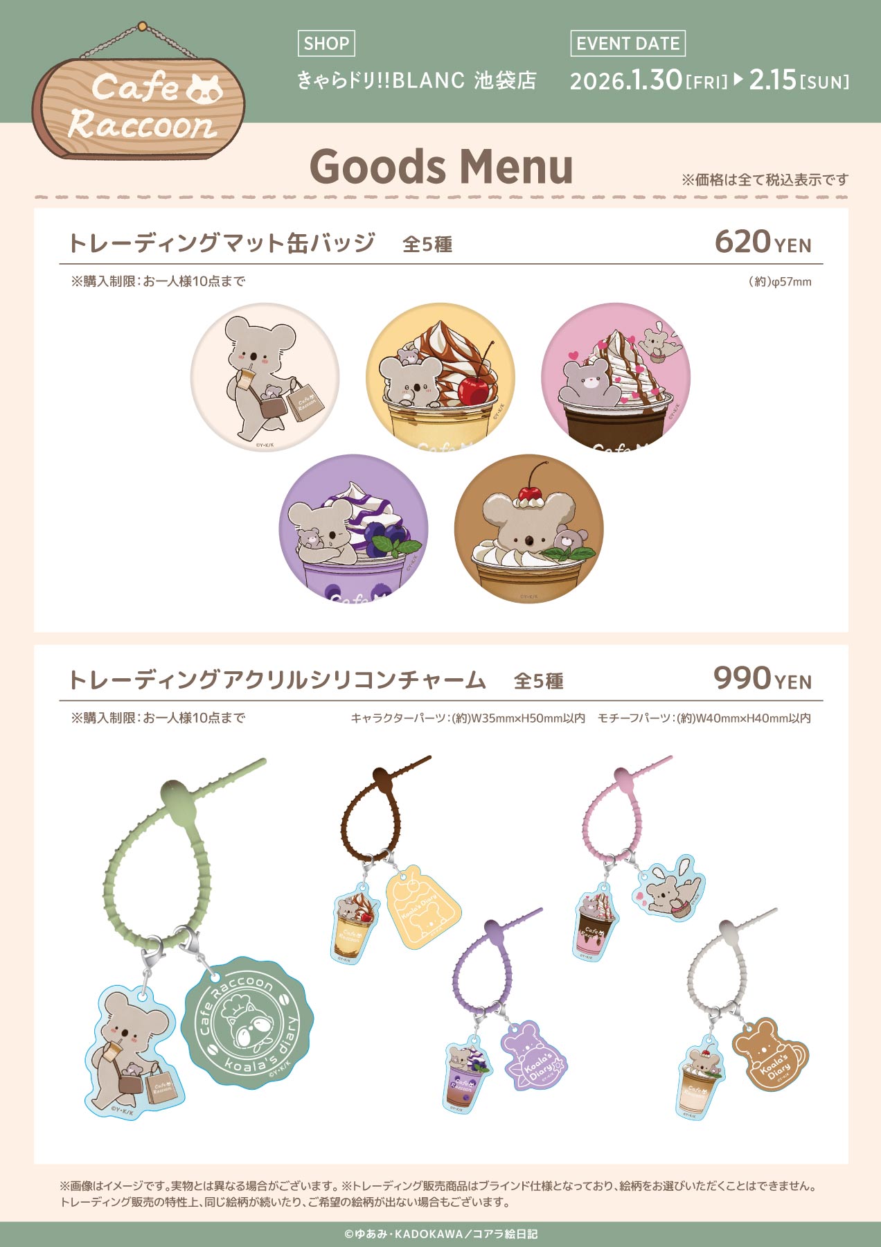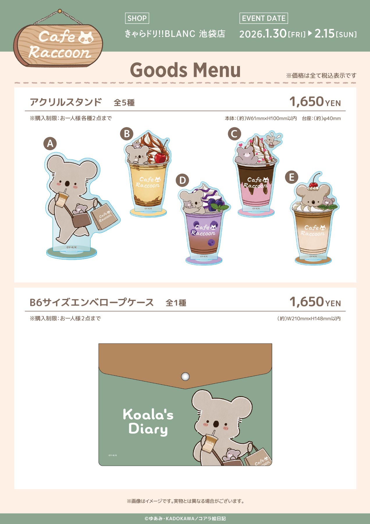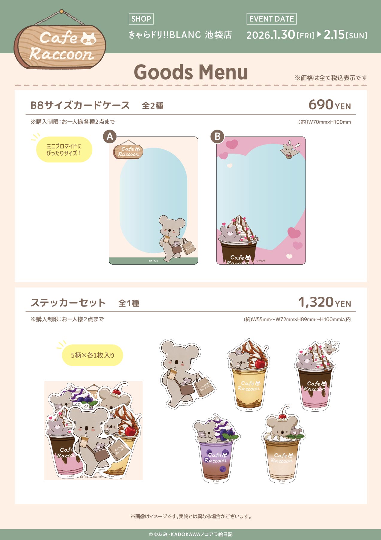 - グッズ・ノベルティ・ご提供メニューはお品切れになる場合がございます。販売をお約束するものではございませんので、あらかじめご了承ください。